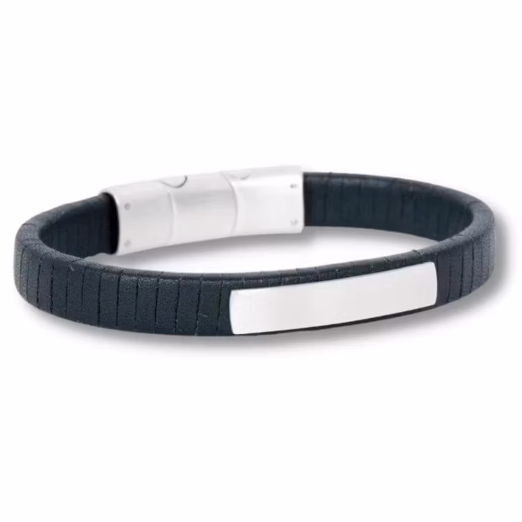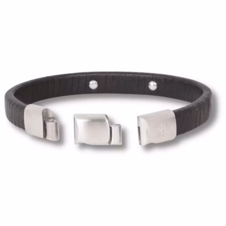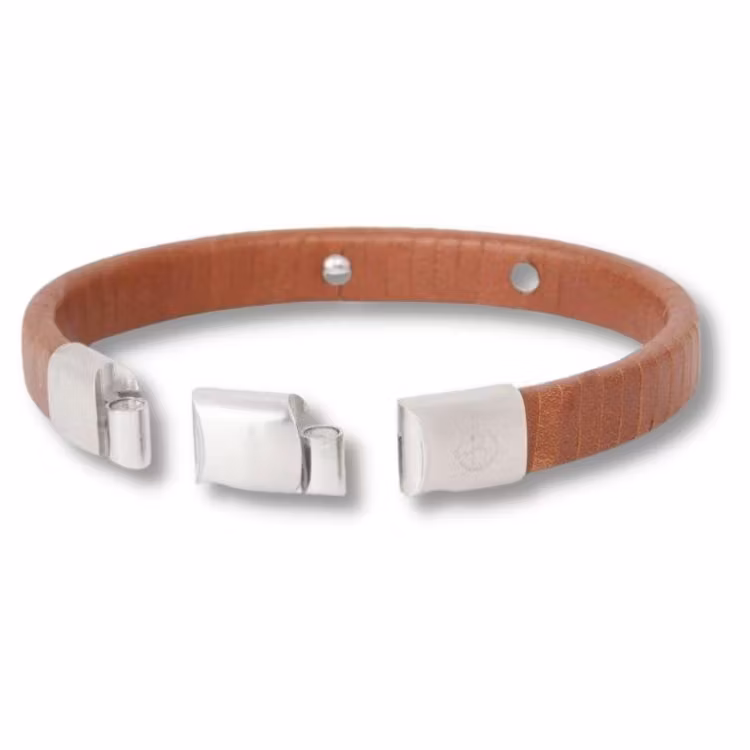 Brown leather bracelet for men with an engraveable steel plate. The bracelet features unique details of the leather being wrapped around the entire band. The leather bracelet is held together with a clasp of stainless steel links and non-stainless steel magnets.