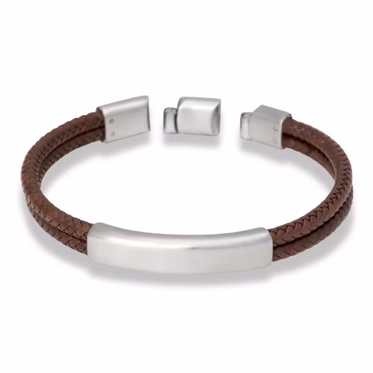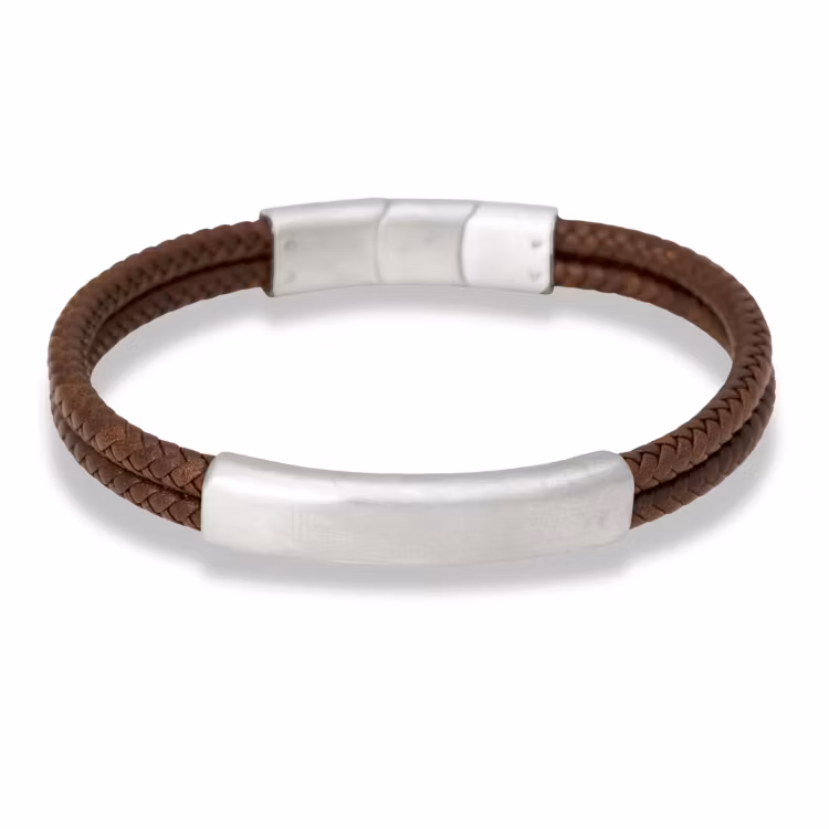 Ett elegant armband i brunt flätat läder som kombinerar klassisk design med moderna detaljer. Den varma lädertonen ger ett tidlöst och sofistikerat uttryck, medan stålbrickan i rostfritt stål tillför en stilren och kraftfull kontrast.