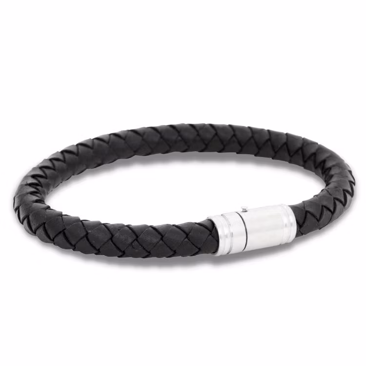 A classic and stylish black leather bracelet with woven leather details and a simple gold-colored steel magnetic clasp. A wider version of our best-selling men's bracelet Liam, designed for men with larger wrists.