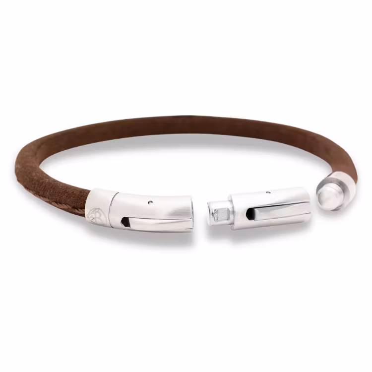 A sleek brown bracelet in suede leather, featuring a stylish seam as a detail. The buckle is made of matte stainless steel, and the bracelet is available in two different sizes (19 cm and 21 cm). If you're unsure about the size, we recommend choosing the larger one. If you need to adjust the size, it's easy to do so by detaching one part of the buckle.