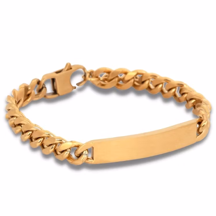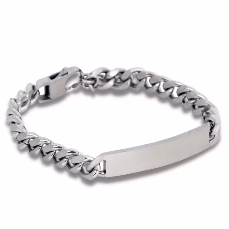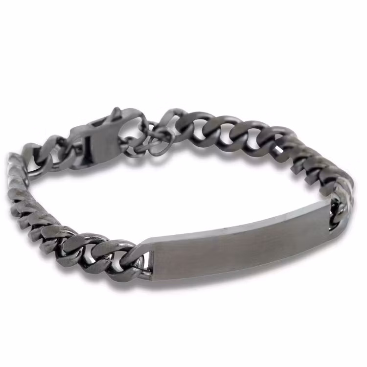 This men's bracelet is a classic curb link in black stainless steel in a wide model with a 5 cm long plate for engraving or leaving plain.