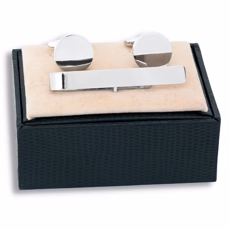 A classic and elegant set featuring round, smooth cufflinks and a matching simple tie clip. This set complements suits of any color and style.