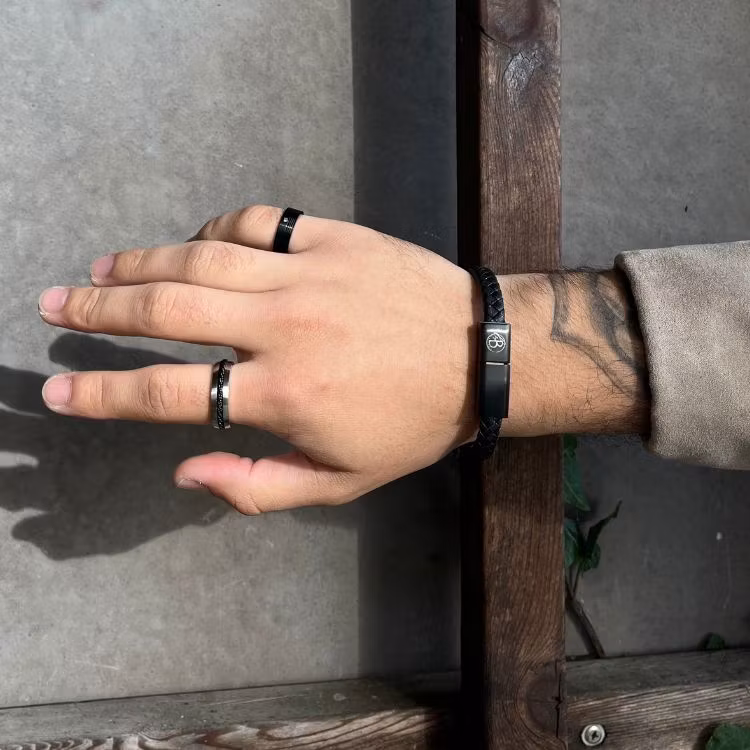 Stylish silver ring in stainless steel with a black chain as a detail. The perfect gift for the man that loves jewelry and accessories.