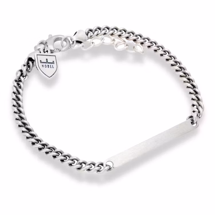 A slim silver bracelet (3 mm wide) featuring a thin, engravable brushed silver tag that provides a slightly matte finish. The bracelet has a slightly darker finish due to being crafted in oxidized 925 sterling silver.