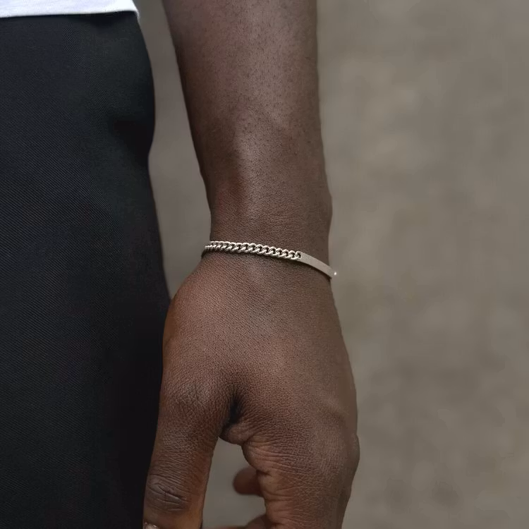A slim silver bracelet (3 mm wide) featuring a thin, engravable brushed silver tag that provides a slightly matte finish.