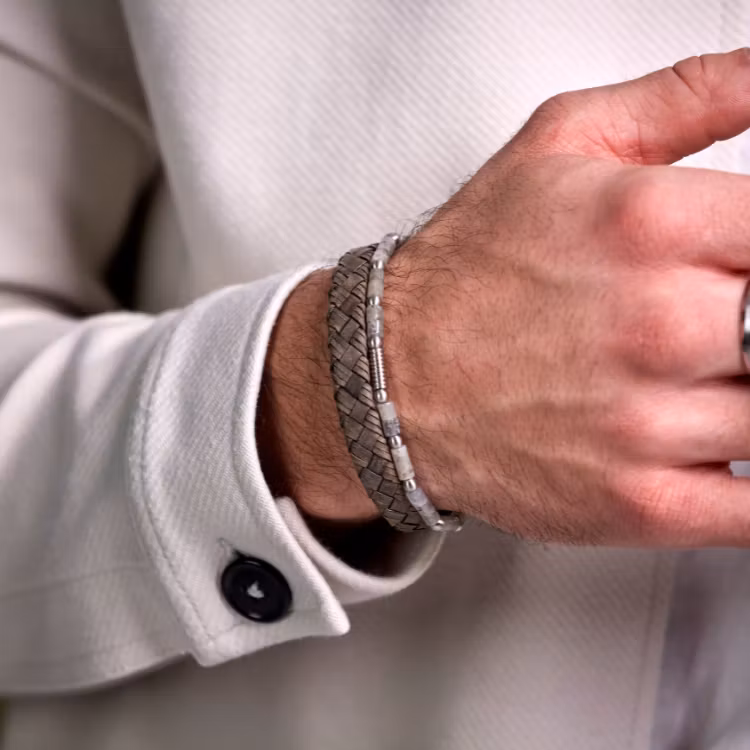 Ett modernt och stilfullt flätat läderarmband i en sofistikerad grå/grön nyans som ger ett unikt och nedtonat uttryck. Den flätade designen skapar struktur och