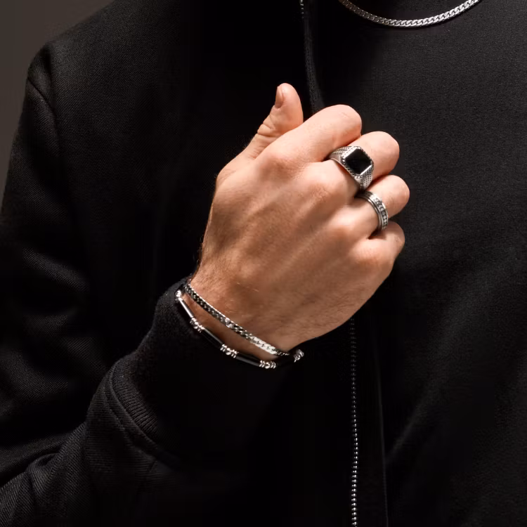 Ett elastiskt armband med svarta ädelstenar av Onyx kombinerat med små kulor av rostfritt stål. Ett elegant armband med subtila detaljer.