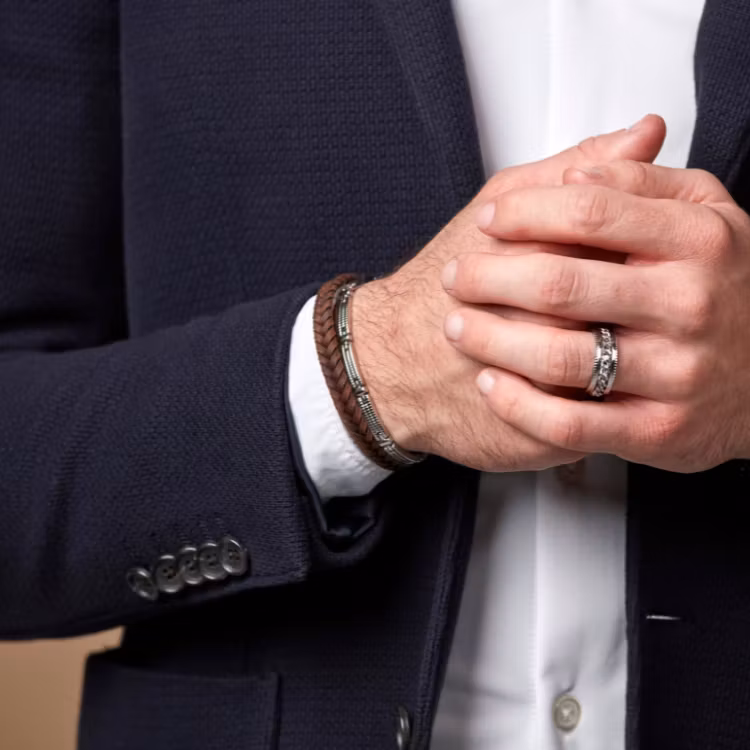 Ett distinkt och modernt armband i mönstrat rostfritt stål som ger ett kraftfullt men sofistikerat uttryck.