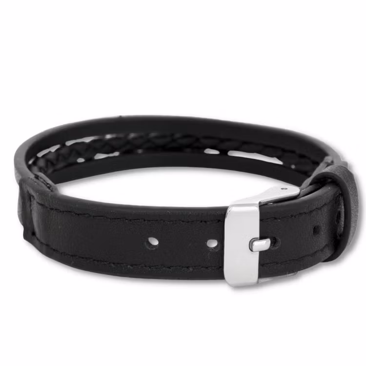 Ett elegant svart läderarmband för män med en unik design som inkluderar tre remmar, varav den övre och undre remmen är släta och den i mitten är flätad. Detta armband kombinerar stil och textur på ett smakfullt sätt, vilket gör det till en perfekt accessoar för olika tillfällen. Läderarmbandet stängs och öppnas med ett klockremsspänne med detaljer i rostfritt stål.