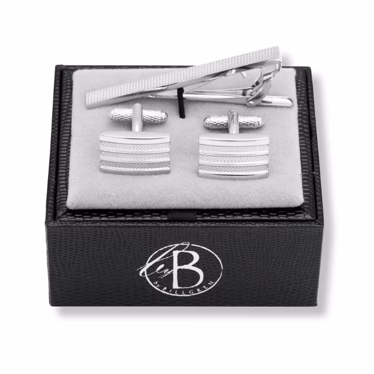 Ett stilfullt set som kombinerar klassisk elegans med moderna detaljer. Detta set innehåller matchande manschettknappar och en slipshållare i silverfärgad metall, med en diskret strukturerad yta som ger ett exklusivt och sofistikerat uttryck.