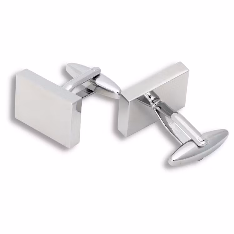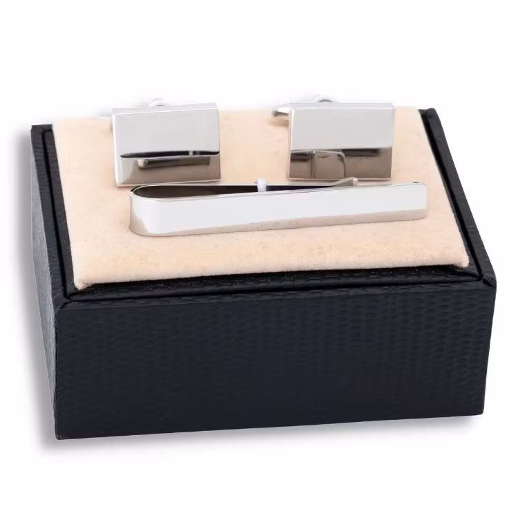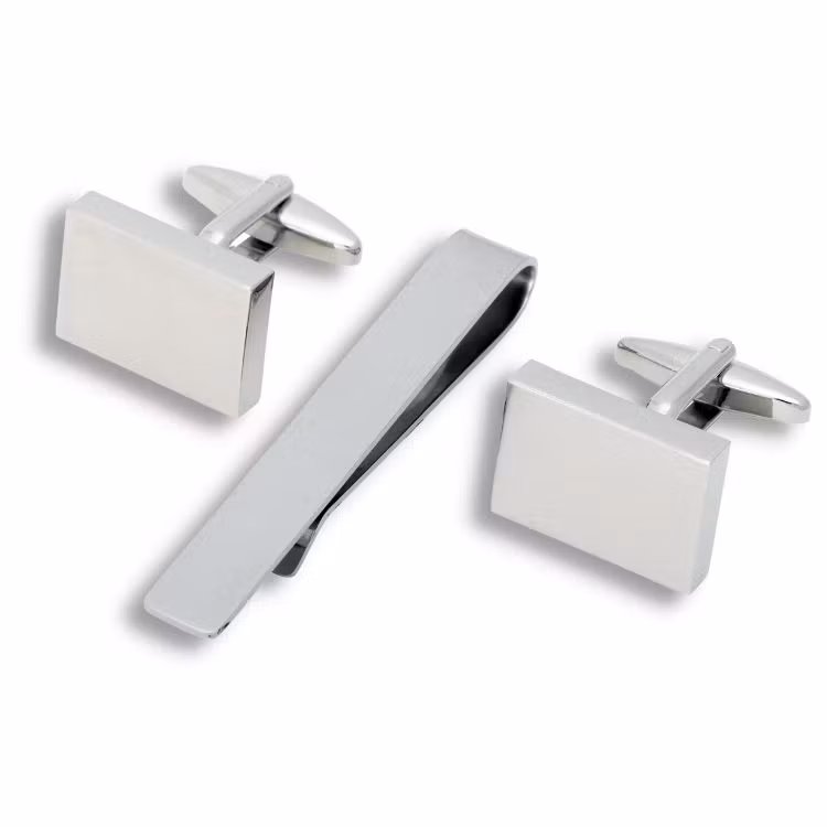 Ett klassiskt och stilrent set med rektangulära, släta manschettknappar och matchande slipsnål. Gör manschettknapparna och slipsnålen unika genom att gravera in något personligt.