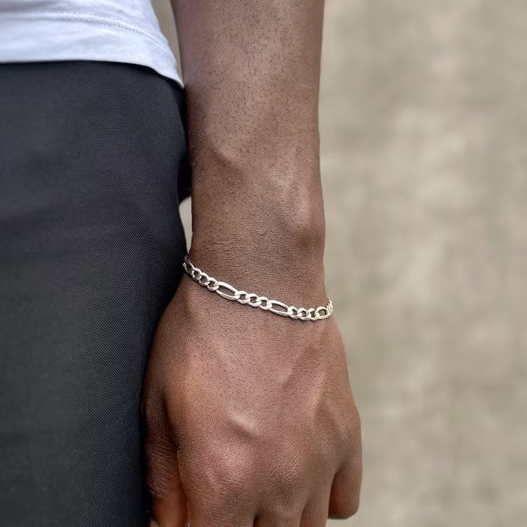 Ett silverarmband i Figarolänk som består av sammanflätade länkar, tre mindre följt av en längre oval som gör designen unik.