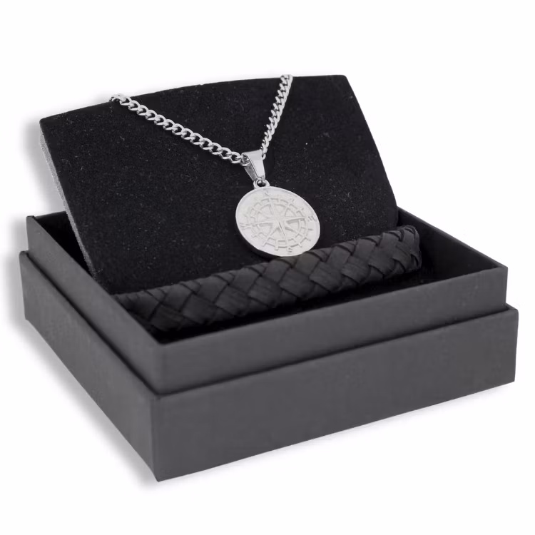 Ge bort en tidlös gåva med ett matchande halsband i rostfritt stål och ett handflätat läderarmband i svart. Kombinationen är avskalad och lätt att matcha, oavsett om den bärs till vardags eller till fest.