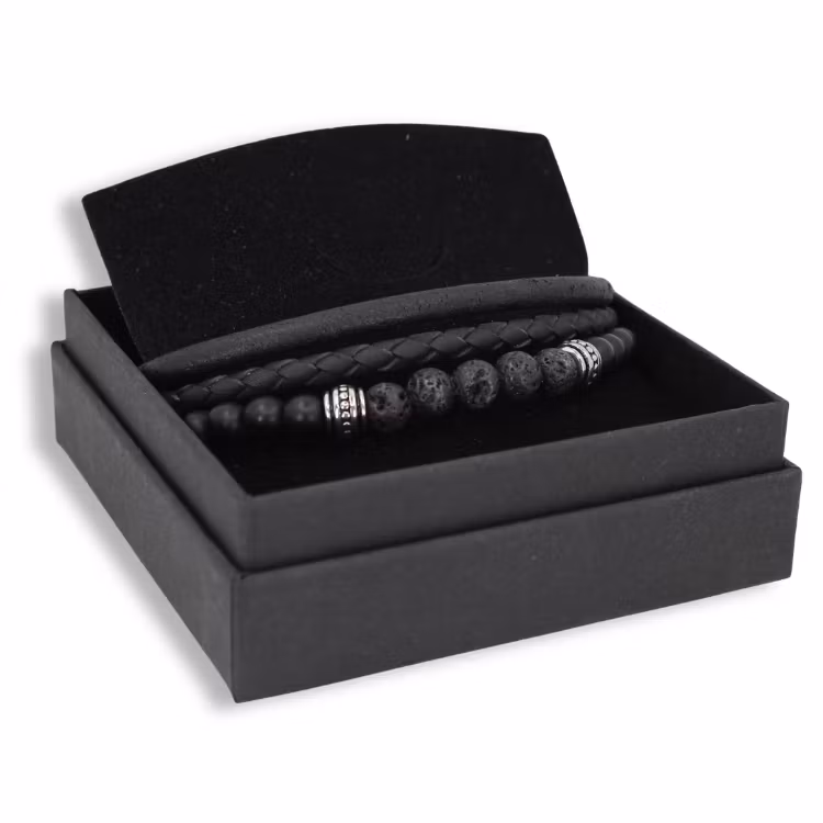 Ge bort en tidlös gåva med ett matchande läderarmband och beadsarmband i helsvart med ståldetaljer. Helheten är stilren och lätt att matcha, oavsett om du bär den till vardags eller till fest.