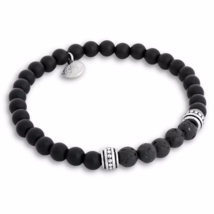 Brett kompletterar med beads i onyx och lavasten för en diskret men tydlig känsla på handleden.