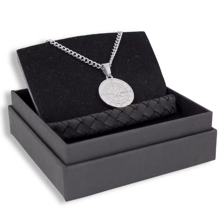 Ge bort en tidlös gåva med ett matchande halsband i rostfritt stål och ett handflätat läderarmband i svart. Kombinationen är avskalad och lätt att matcha, oavsett om den bärs till vardags eller till fest.