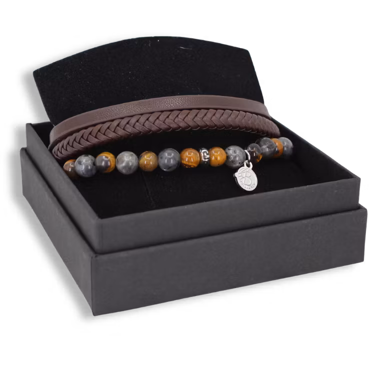 Bruce kompletterar med beads i jaspis och tigeröga i bruna och grå nyanser som ger en subtil men kraftfull känsla – ett armband som passar lika bra till vardags som till mer uppklädda tillfällen.