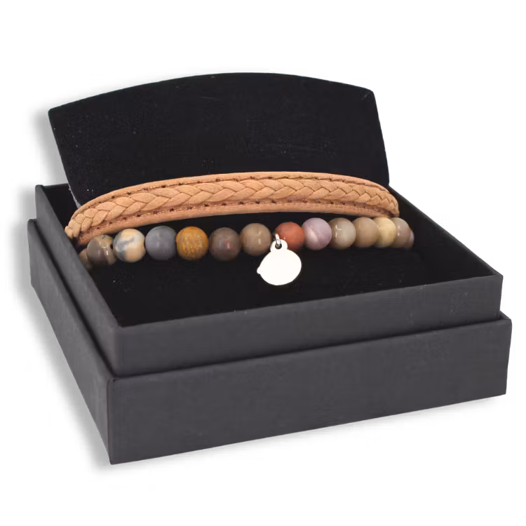 Ge bort en tidlös gåva med  ett matchande läderarmband och beadsarmband med mjuka naturtoner och ståldetaljer. Kombinationen av äkta läder och ädelstenar skapar en balanserad look som funkar lika bra till vardags som till mer uppklädda tillfällen – bär dem tillsammans eller var för sig.